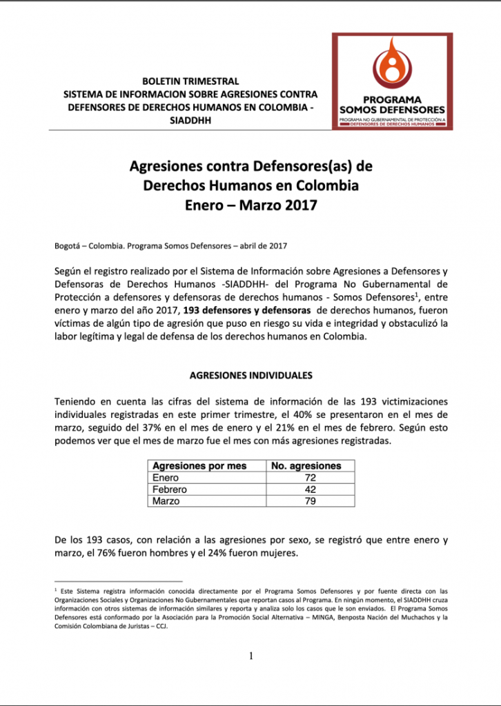 Según el registro realizado por el Sistema de Información sobre Agresiones a Defensores y Defensoras de Derechos Humanos -SIADDHH- del Programa No Gubernamental de Protección a defensores y defensoras de derechos humanos – Somos Defensores[1], entre enero y marzo del año 2017, 193 defensores y defensoras de derechos humanos, fueron víctimas de algún tipo de agresión que puso en riesgo su vida e integridad y obstaculizó la labor legítima y legal de defensa de los derechos humanos en Colombia.