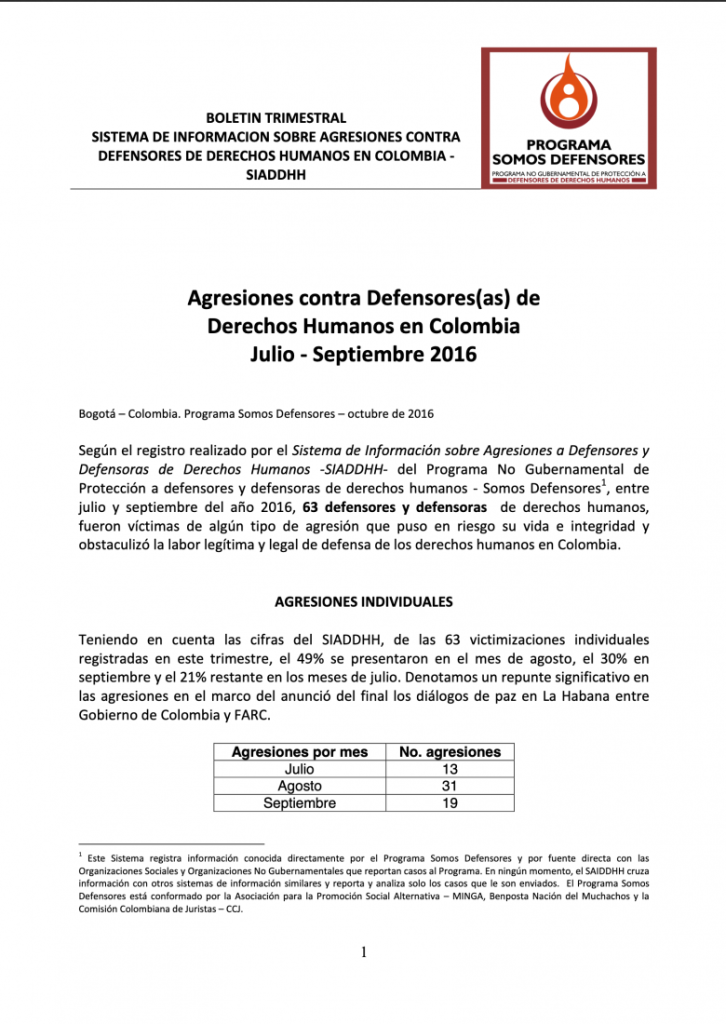 Según el registro realizado por el Sistema de Información sobre Agresiones a Defensores y Defensoras de Derechos Humanos -SIADDHH- del Programa No Gubernamental de Protección a defensores y defensoras de derechos humanos – Somos Defensores[1], entre julio y septiembre del año 2016, 63 defensores y defensoras de derechos humanos, fueron víctimas de algún tipo de agresión que puso en riesgo su vida e integridad y obstaculizó la labor legítima y legal de defensa de los derechos humanos en Colombia.