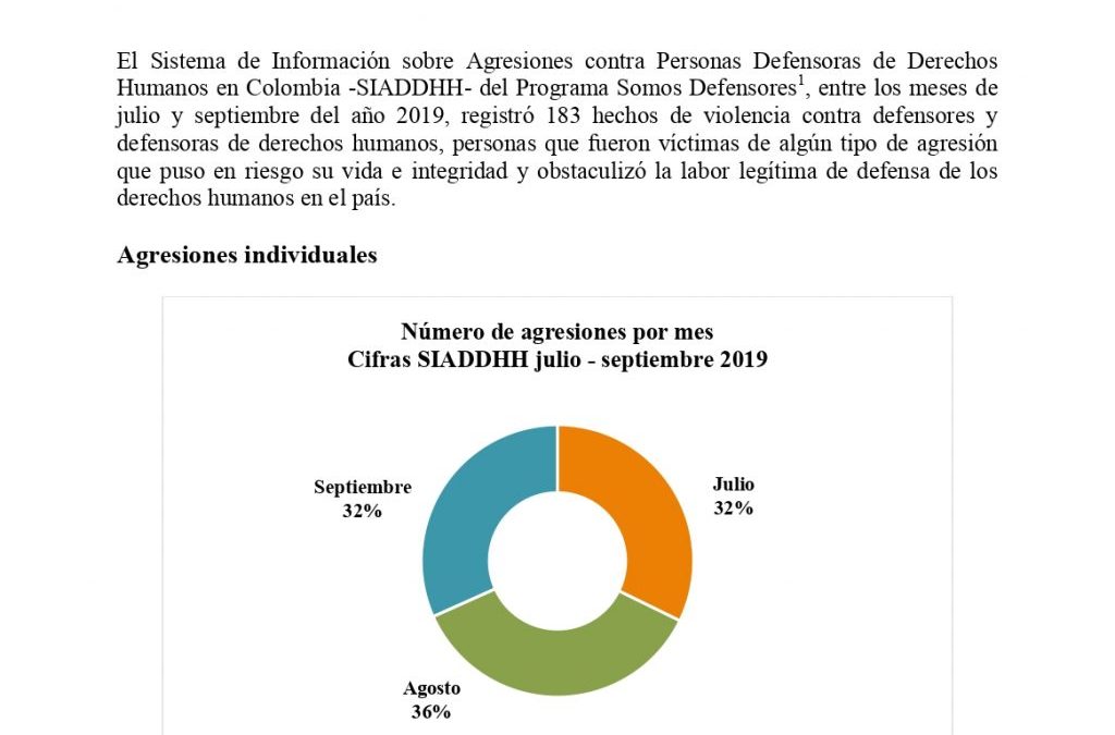 El Sistema de Información sobre Agresiones contra Personas Defensoras de Derechos Humanos en Colombia -SIADDHH- del Programa Somos Defensores, entre los meses de julio y septiembre del año 2019, registró 183 hechos de violencia contra defensores y defensoras de derechos humanos, personas que fueron víctimas de algún tipo de agresión que puso en riesgo su vida e integridad y obstaculizó la labor legítima de defensa de los derechos humanos en el país.