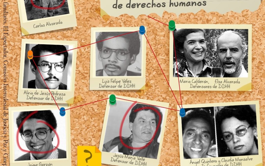El informe, que tiene como fuente principal expedientes judiciales nacionales e internacionales, así como fuentes primarias y secundarias, documenta seis casos de graves vulneraciones a los derechos humanos de ocho personas defensoras y un familiar de una de ellas. Se trata de los homicidios del profesor Luis Felipe Vélez Herrera (1987), de los investigadores del Centro de Investigación y Educación Popular / Programa por la Paz (CINEP/PPP) Mario Calderón Villegas y Elsa Constanza Alvarado Chacón, junto al padre de ella, el señor Carlos Alvarado Pantoja (1997), del abogado antioqueño Jesús María Valle Jaramillo (1998) y del periodista y humorista político Jaime Hernando Garzón Forero (1999).