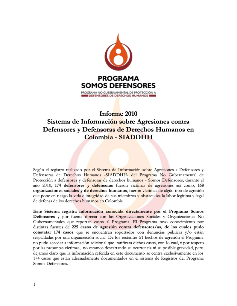 Según el registro realizado por el Sistema de Información sobre Agresiones a Defensores y Defensoras de Derechos Humanos -SIADDHH- del Programa No Gubernamental de Protección a defensores y defensoras de derechos humanos – Somos Defensores, durante el año 2010, 174 defensores y defensoras fueron víctimas de agresiones así como, 168 organizaciones sociales y de derechos humanos, fueron víctimas de algún tipo de agresión que pone en riesgo la vida e integridad de sus miembros y obstaculiza la labor legitima y legal de defensa de los derechos humanos en Colombia.